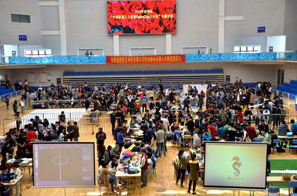 在开幕式顺利举办后,本次大赛于体育馆主馆正式开始。各参赛队伍在仿人机器人短跑比赛、仿人机器人单人或多人舞蹈比赛、智能停车购物等10个大项、12个小项间展开激烈角逐。我校来自计算机科学与技术系卓越IT工程师俱乐部、由计科系教师高玲玲、张贯虹指导的四支队伍参与此次大赛。比赛现场选手们皆心无旁骛,全神贯注,不断调试数据,力争让参赛机器人发挥出最佳水平。经过历时近两日的比拼,比赛最终落下帷幕,我校代表队分别在仿人机器人短跑比赛与仿人机器人障碍跑比赛中荣膺冠军。
