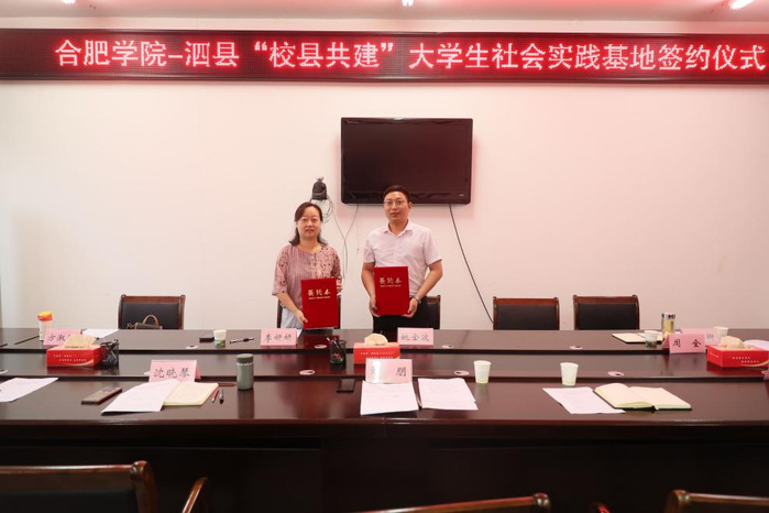 7月6日下午,合肥学院—泗县“校县共建”大学生社会实践基地签约仪式在泗县县委组织部举行。泗县县委常委、组织部部长、统战部部长刘朋,县委组织部副部长沈晓琴、团泗县县委书记姚金波,我校党委组织部正处级组织员周全、外国语学院党委书记吴孔宝、团委副书记李妍妍、副处级组织员张海卿等参加会议,会议由刘朋主持。