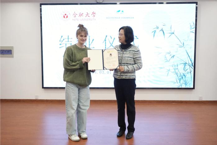 Bei der Abschlussfeier überreichte die Präsidentin Frau Wu Chunmei allen Studierenden, die die Prüfung bestanden hatten, Zertifikate. Sie ermutigte die deutschen Studenten, weiterhin die chinesische Sprache und Kultur zu erlernen, und hieß sie willkommen, an der Universität Hefei zu studieren, um an der deutsch-chinesischen Bildungskooperation teilzunehmen und die deutsch-chinesischen freundschaftlichen Beziehungen weiter auszubauen.